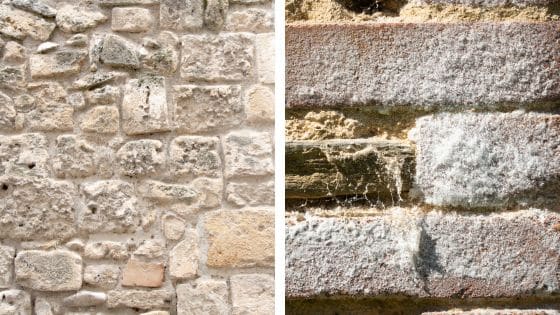 - du salpêtre à la surface des murs en pierre (dépôt de couleur blanchâtre ayant un aspect poudreux, cristallin),